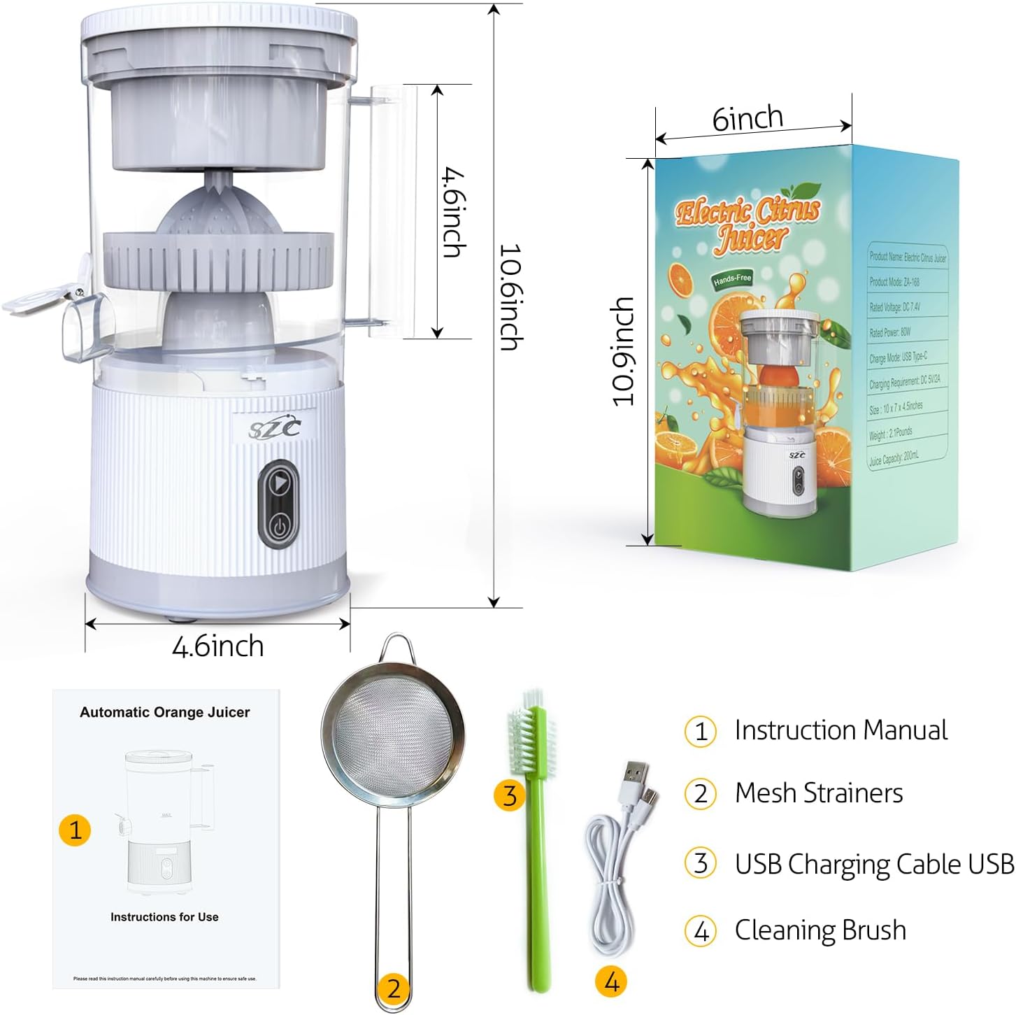 • GREAT GIFT IDEA: This portable juicer makes the perfect present for anyone who adores fresh citrus juice! Share the joy of healthy and delicious juice with your loved ones and encourage them to adopt a healthier lifestyle.Tips: 1. For safety reasons, DO NOT use the juicer while it is charging. 2. The charging time is approximately 150 minutes, and the indicator light will change from red to white when fully charged.
